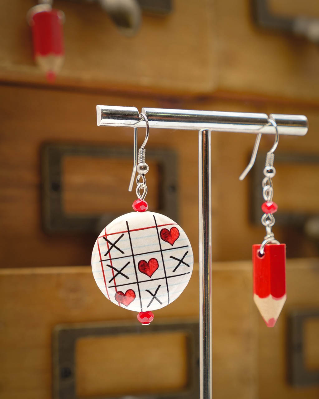 Orecchini in legno laccato tema tris di cuori e matita rossa.