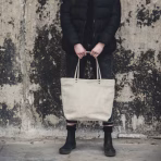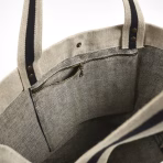 Borsa shopper in lino naturale, con manici in passamaneria di lino. Chiusura con 3 bottoni automatici.