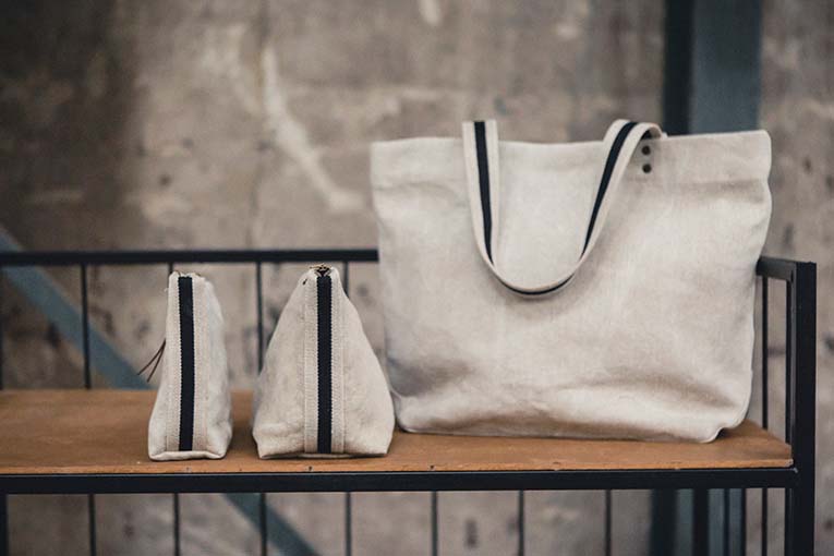 Fodera in lino a spina di pesce nero e naturale, con 2 tasche chiusura cerniera.