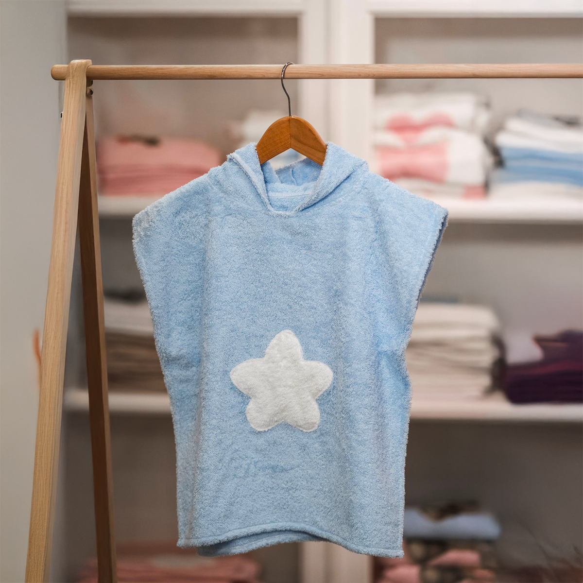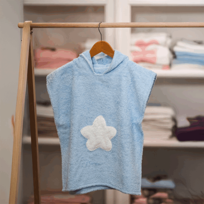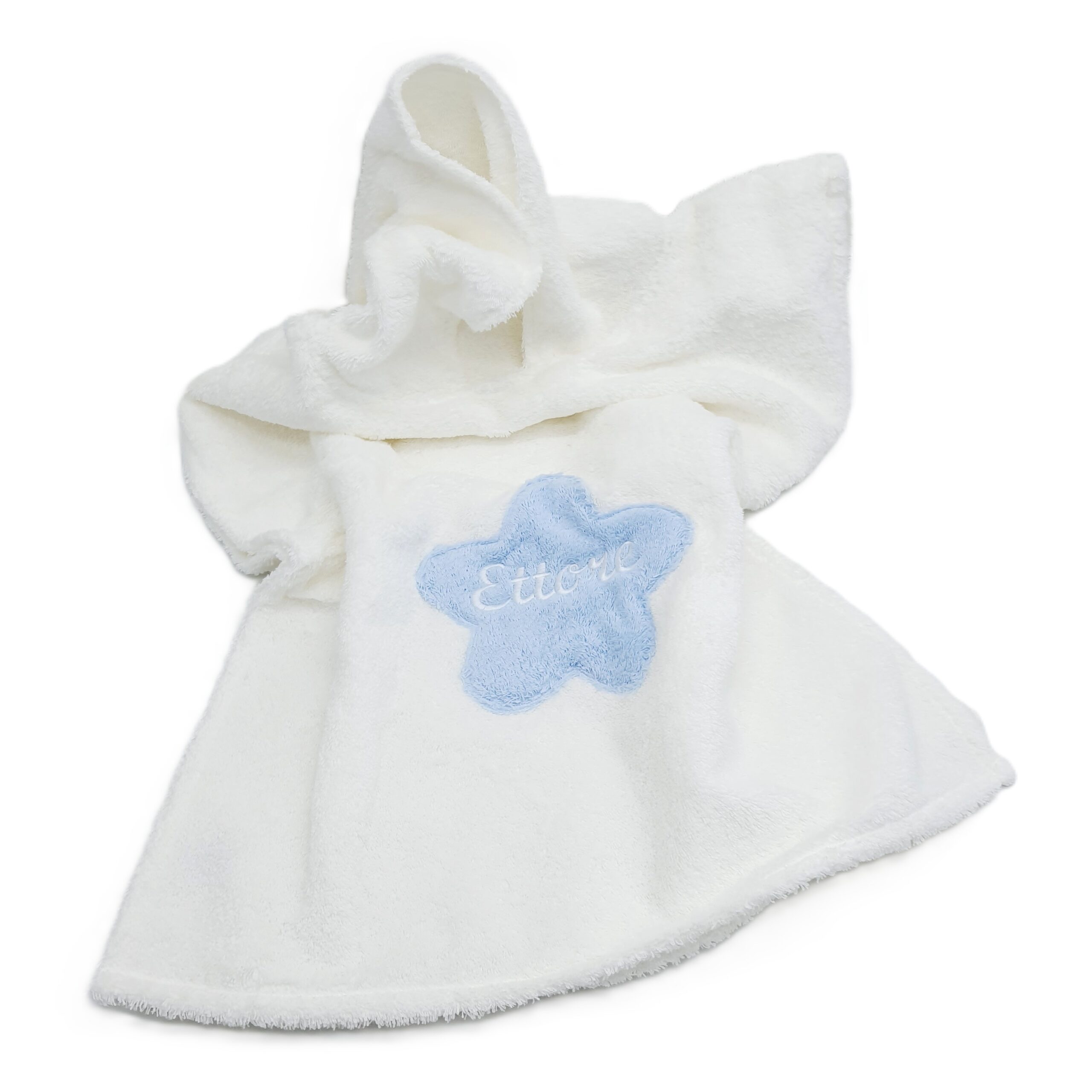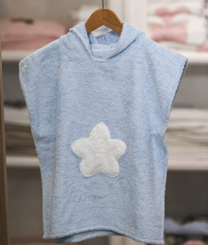 Poncho in spugna panna o azzurra, con applicazione stella in spugna in contro-colore.