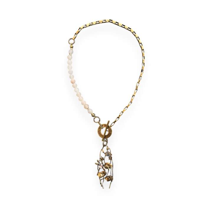 Girocollo dorato con una parte in pietre in agata rosa e pendente dorato con fiori in rilievo