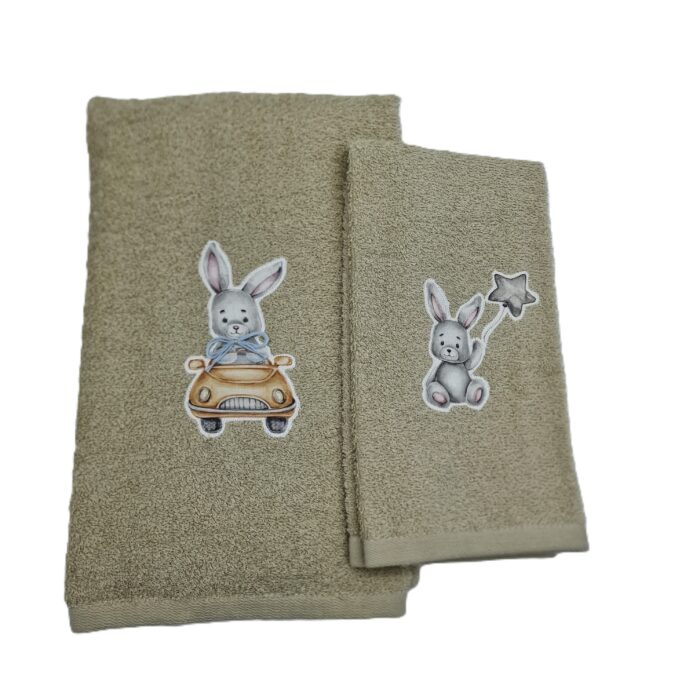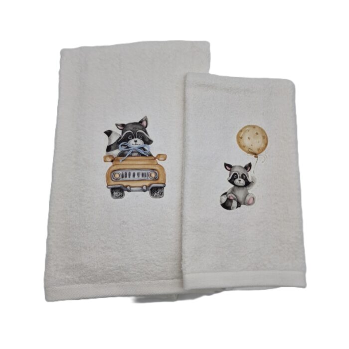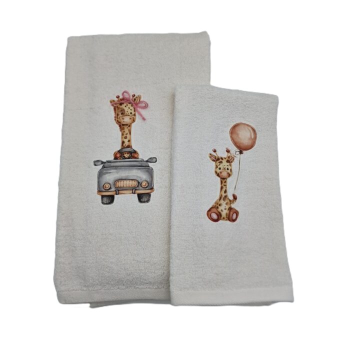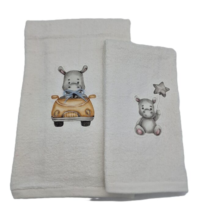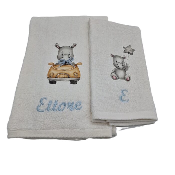 Coppia di asciugamani in spugna 530gr/mq (telo viso 60×110 cm + telo ospite 60×40 cm) con applicazione animaletti stampati su cotone.