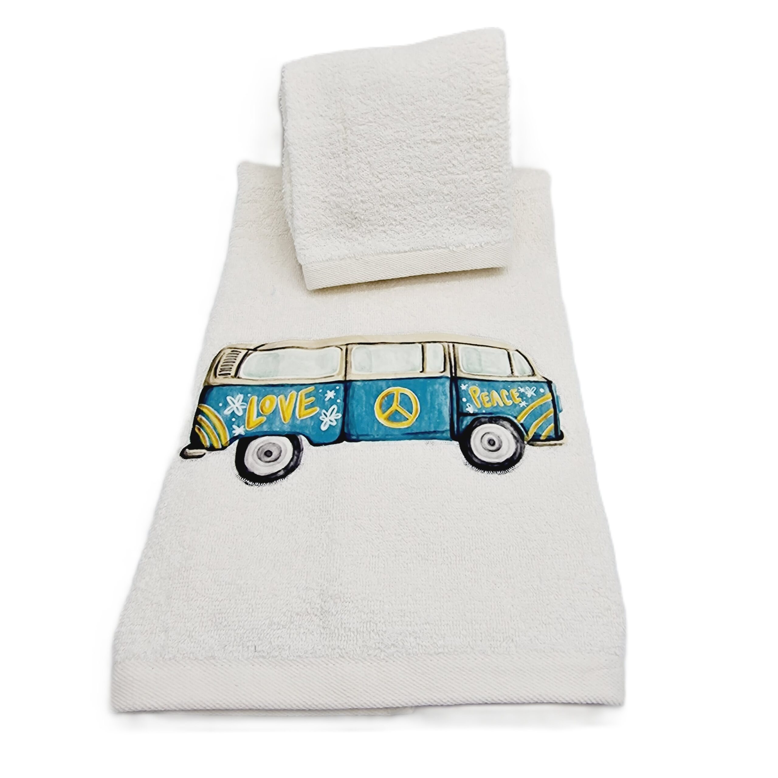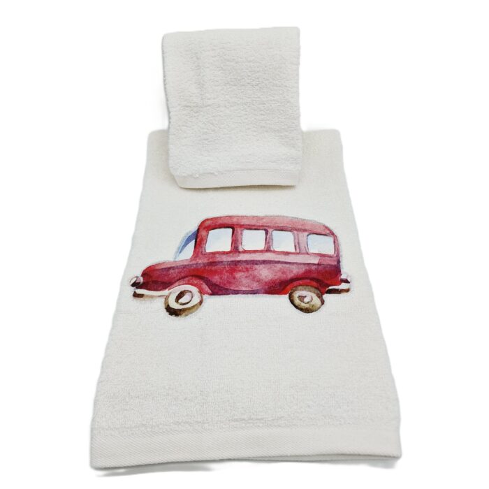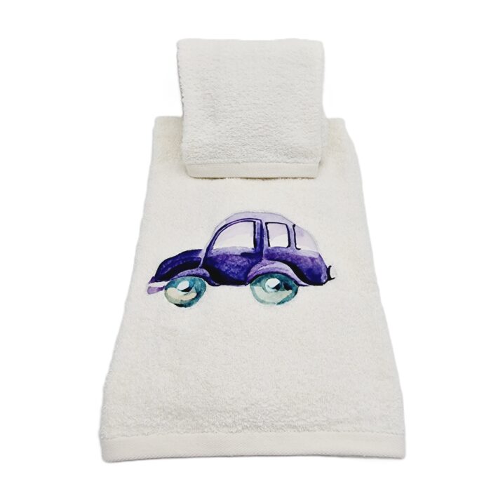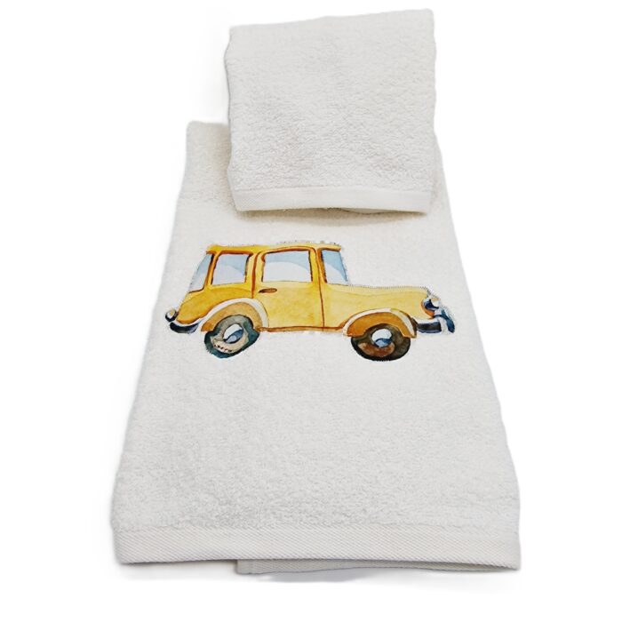 Coppia asciugamani in spugna (telo viso + telo ospite) colore panna con applicazione macchinina colorata.