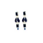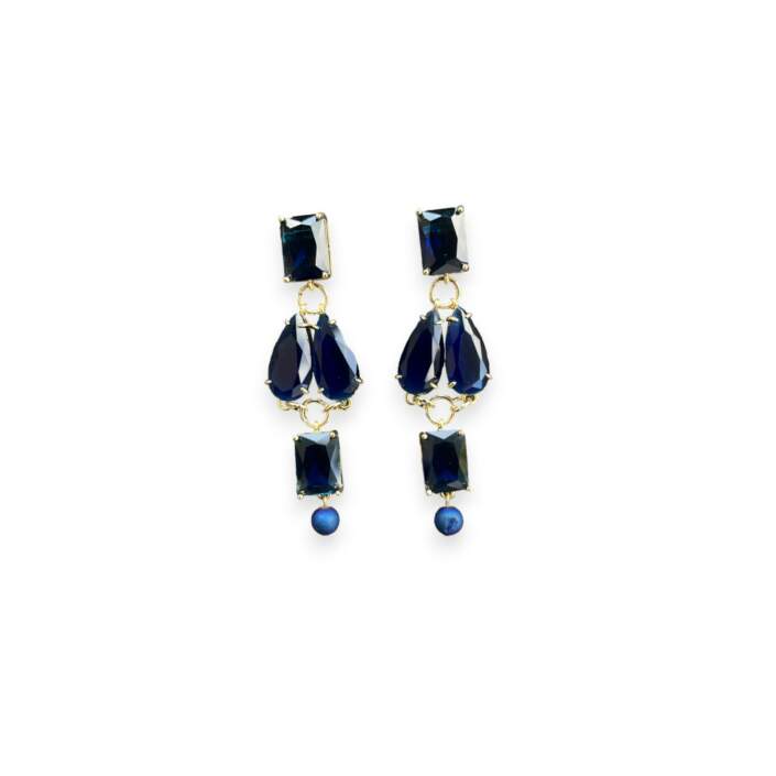 Orecchini con cristalli blu rettangolari e a goccia, rifiniti da una piccola sfera blu
