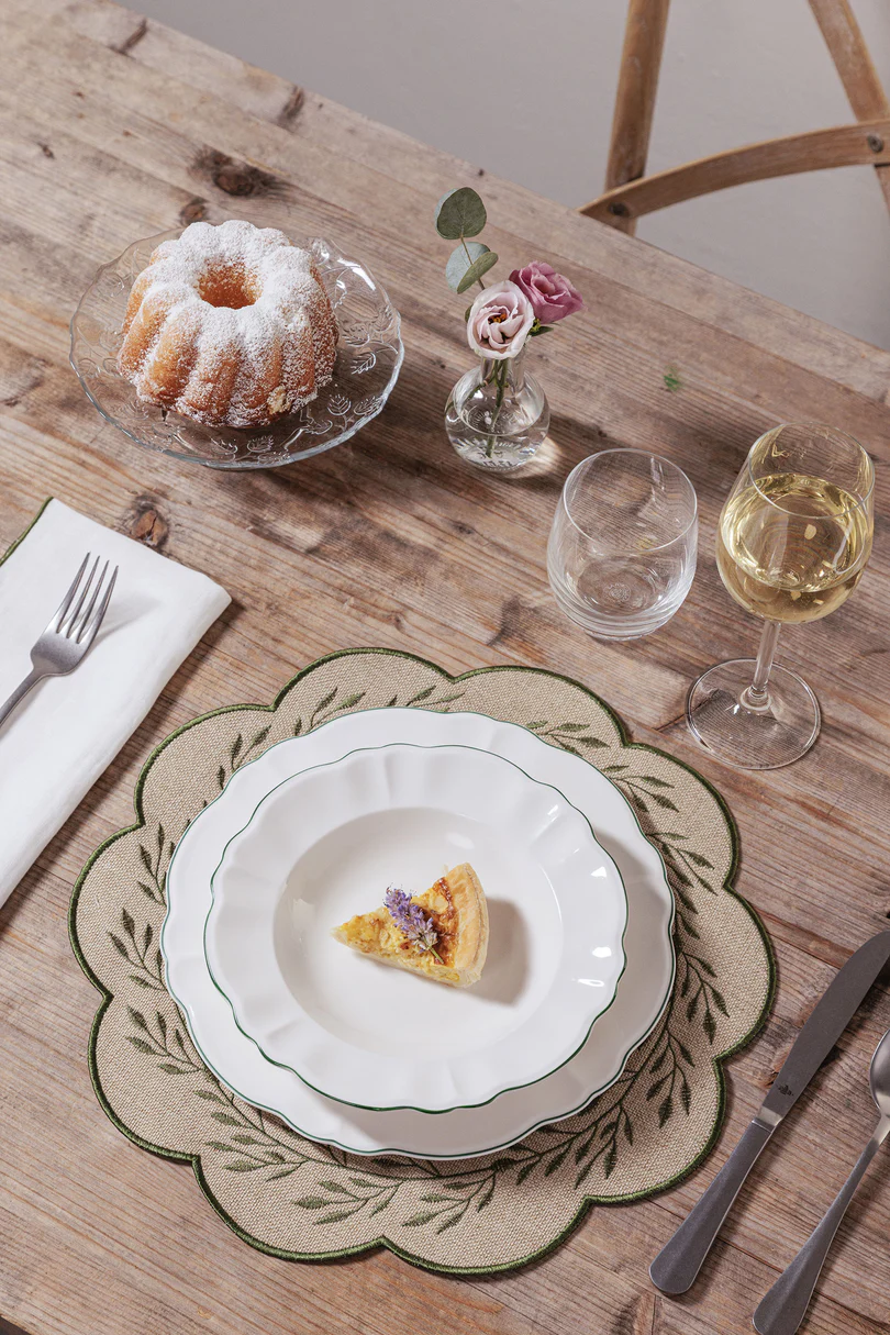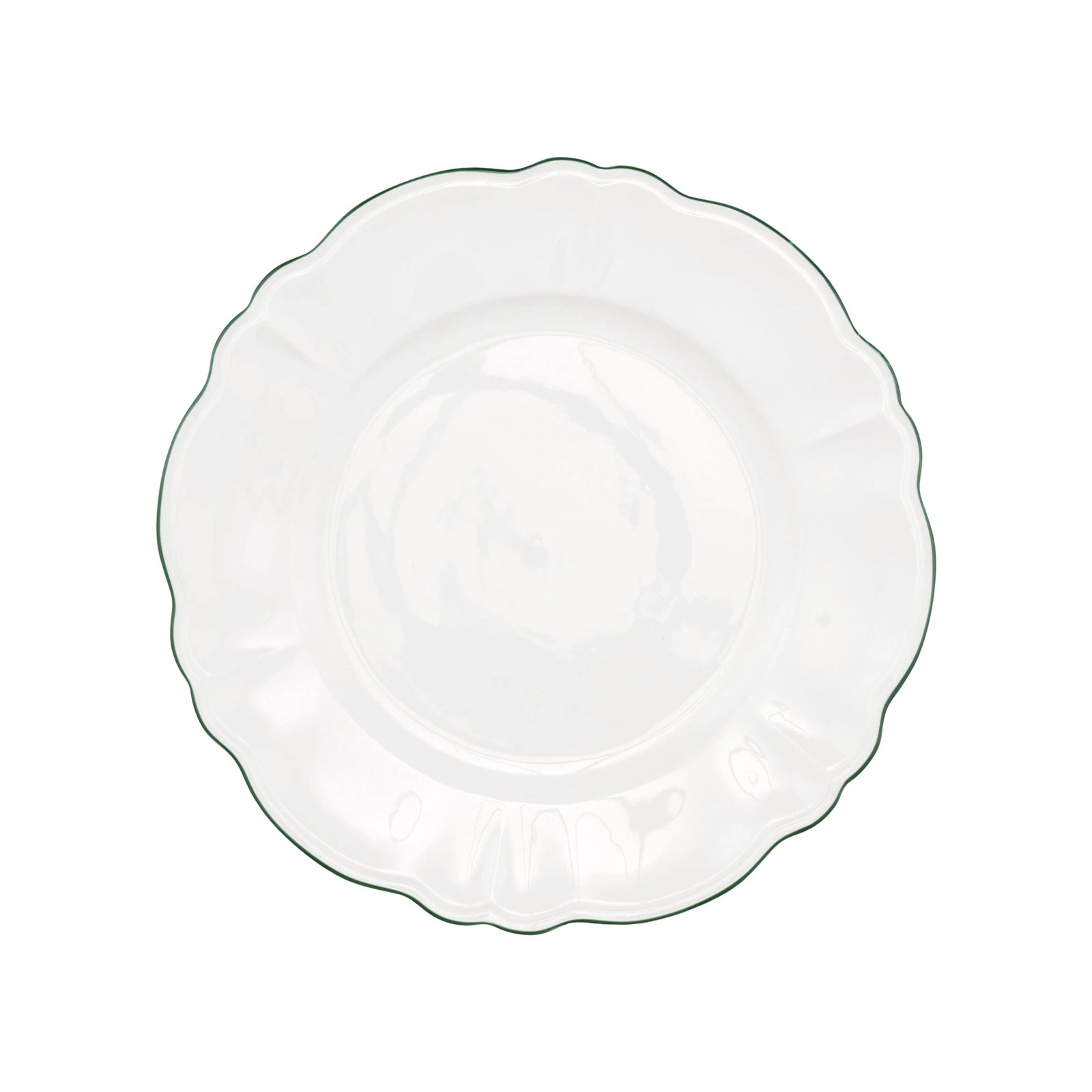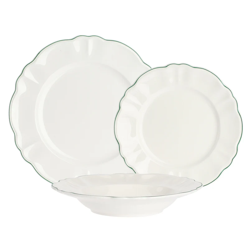 Set 18 pezzi tavola (6 piatti piani, 6 piatti fondi, 6 piatti frutta) in porcellana bianca “bone china”, con profilo verde.