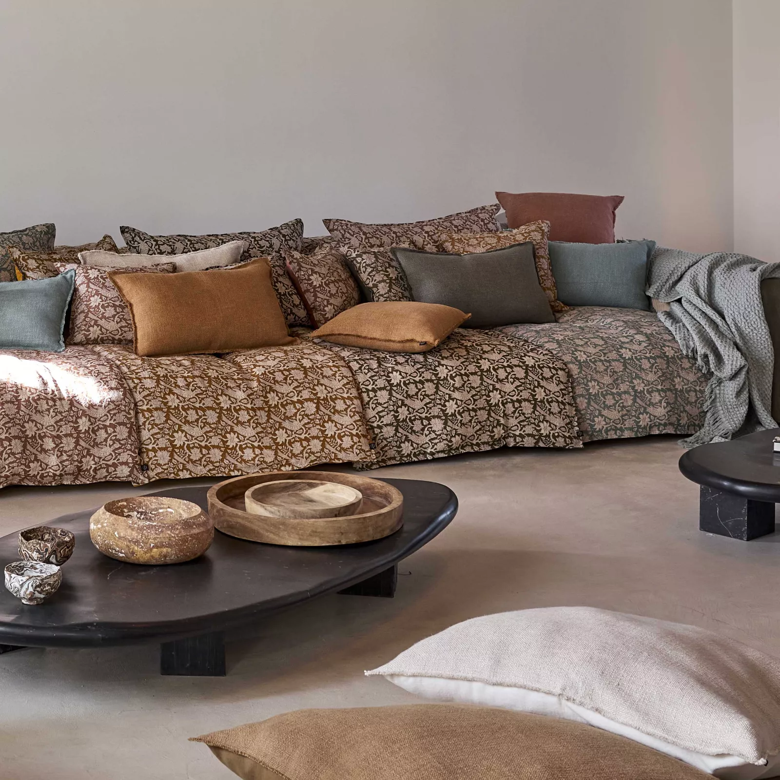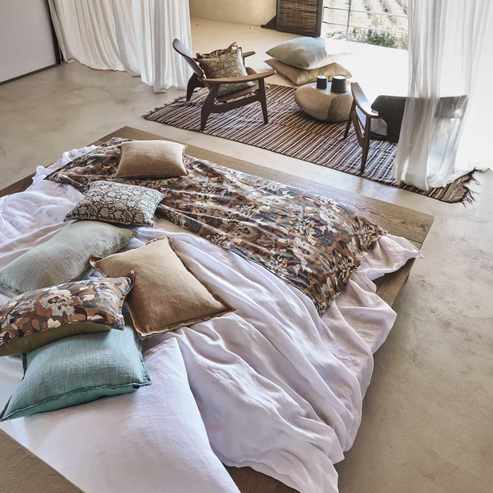 Plaid / copripiedi in lino stampato fantasia “Jaipur”, con imbottitura 100gr estraibile e chiusura con cerniera.