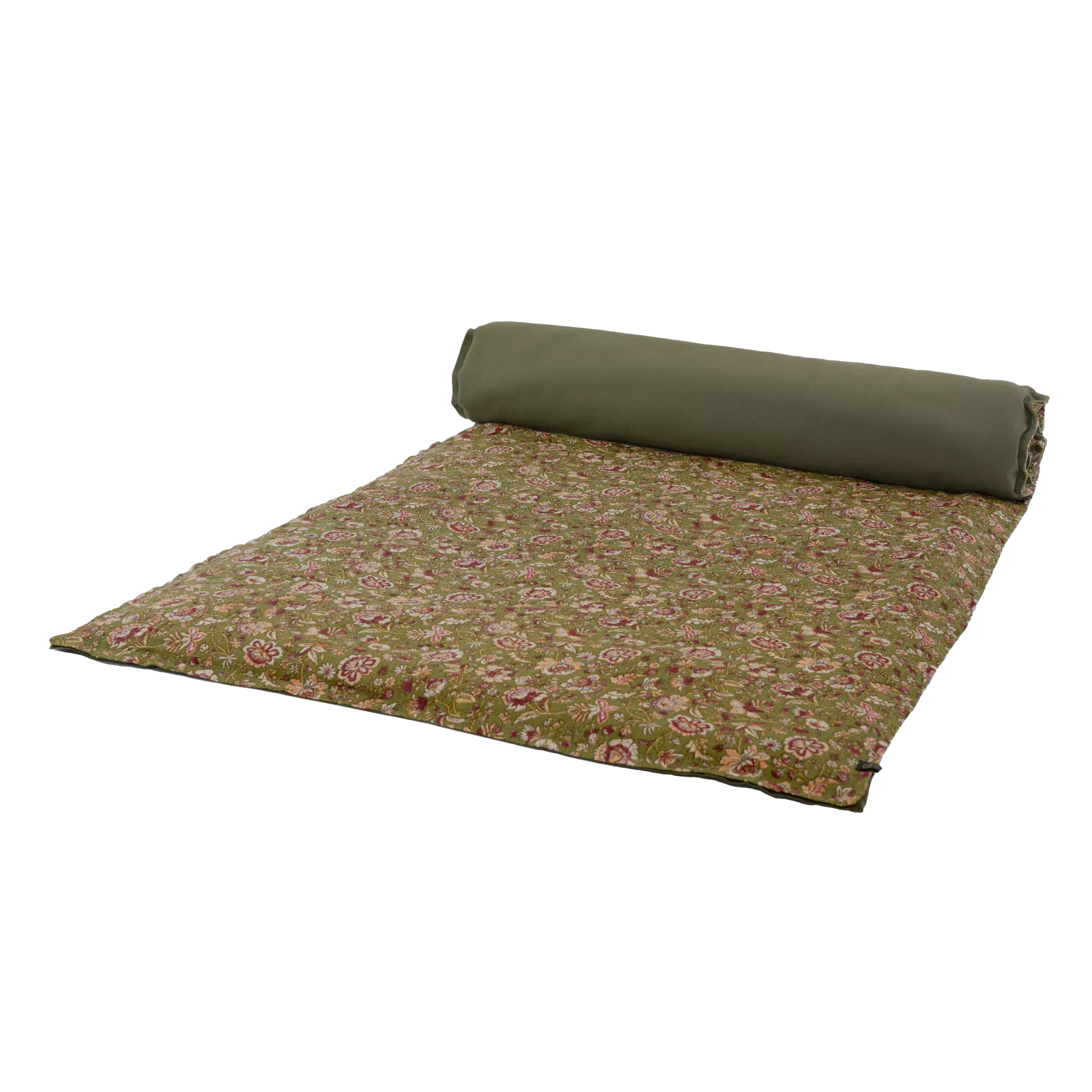 Plaid / copripiedi in lino stampato fantasia floreale, con imbottitura 100gr estraibile e chiusura con cerniera.